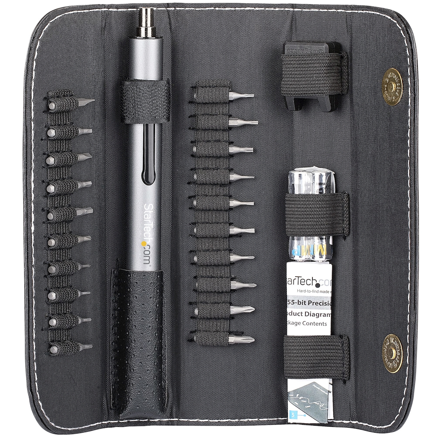Ce tournevis sans fil est l'outil idéal pour démonter et remonter les appareils électroniques pendant les réparations. L'ensemble du tournevis à piles comprend un tournevis électrique de précision (2 piles AAA incluses), 20 micro-embouts et un magnétiseur/démagnétiseur, logés dans une mallette de transport souple et durable. Les embouts inclus ont été spécialement sélectionnés pour être compatibles avec la plupart des grandes marques de smartphones, tablettes et ordinateurs portables, y compris mais sans s'y limiter les iPhone, iPad, MacBooks d'Apple; les Chromebooks Samsung Galaxy, HP et Acer, ainsi que les Lenovo ThinkPad.